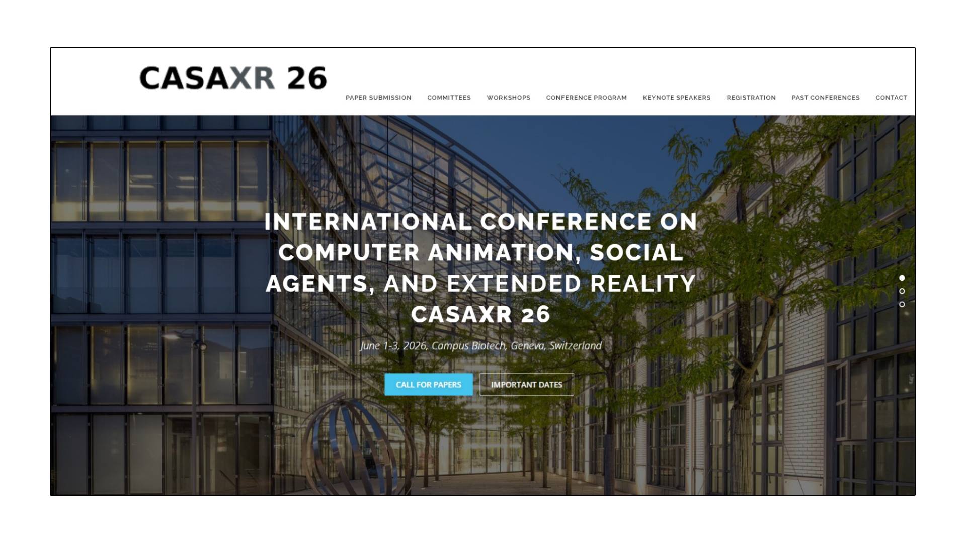 This yeaR, the International Conference on Computer Animation, Social Agents, and Extended Reality (CASAXR)is organized by MIRALab, University of Geneva, Switzerland together with the Computer Graphics Society (CGS) and will be held at Campus Biotech, Geneva, Switzerland, from June 1-3, 2026 .